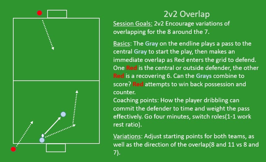 What we want instead is for players to recognize overlaps as a tool for creating overloads generally, to understand contextually when it’s on, how to organize, and how to make it destabilize the opposition with representational space, opposition, and teammates.