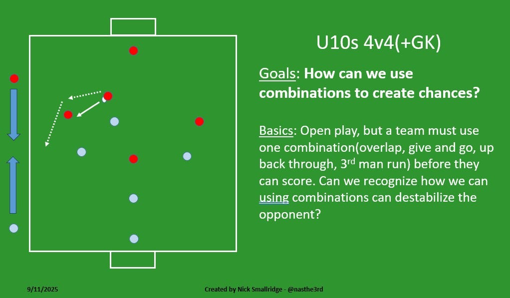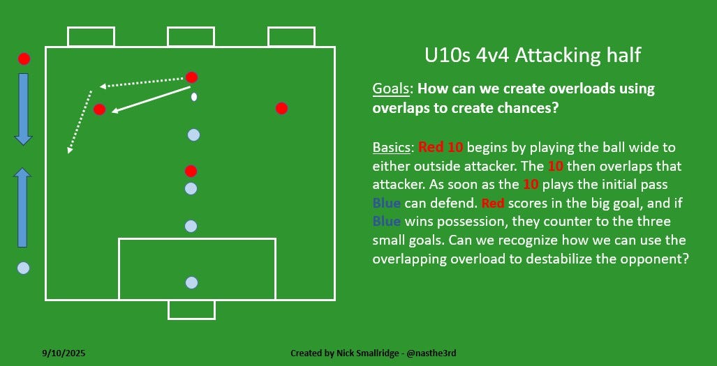 By now, the functional fit of overlaps has been embedded. Now, with open play, players can explore when and where to use that combination to destabilize the opposition and exploit the overload created, or the misdirection of the overlapping runner.